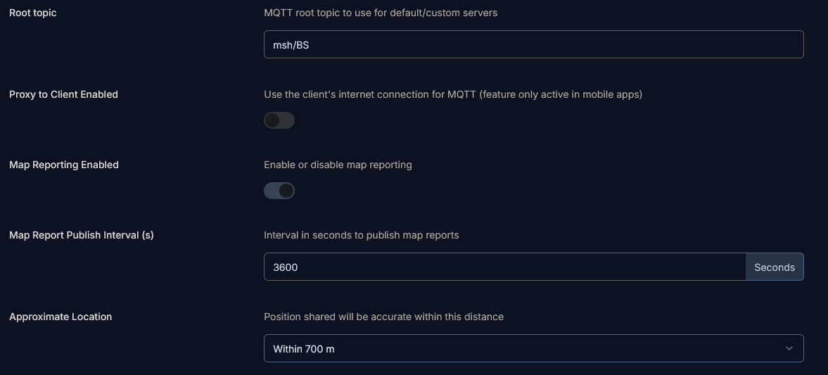 Root topic should be set to msh/BS, as our MQTT traffic gets forwarded to the primary MQTT server hosted by Meshtastic, and this will allow nodes to be easily filtered. Proxy to Client Enabled should be turned on for a mobile node that is typically paired with a phone. This allows the node to communicate with the MQTT server via the phone's Internet connection. Approximate location can be set to whatever you want it to be, in order to fudge your exact location.