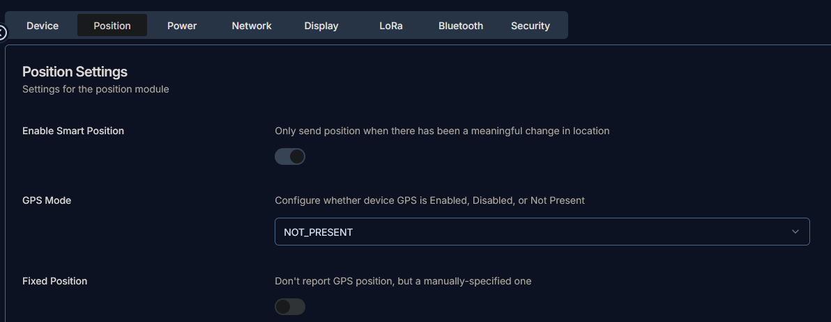 Enable position reporting. This is optional, and inaccuracy can be added to mitigate privacy concerns. Smart Position will only send a location broadcast to the mesh if your node has moved. This is helpful as it avoids unnecessary traffic on the mesh. GPS Mode likely should be set to NOT_PRESENT, the node will pull the location data from your phone. Fixed Position is useful if you have a remote node, or a node on your roof, that won't be moving around, and will not be connected via Bluetooth to a device with a GPS. The web app isn't able to actually set this position, but you can do it via the Android app by manually entering the coordinates, or via the iOS app by mirroring your device's current location, or connecting to the node with the Meshsense desktop app and dragging and dropping.
