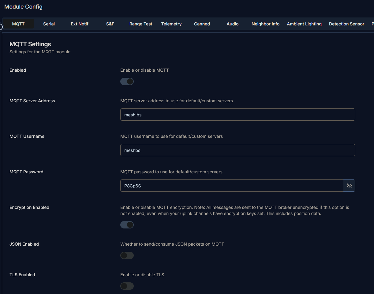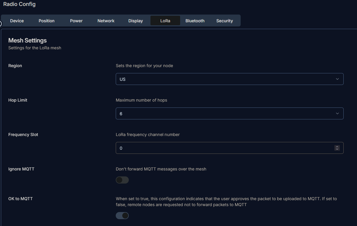 The radio's Region should be set to US, since we follow FCC rules for ISM 900 here. Hop limit should be low, but I've been increasing it to 6 while we build things out. With more nodes and more traffic, this will likely need to be turned back to the default of 3.MQTT should be enabled. This allows your node's traffic to be forwarded to the MESH.BS MQTT server by other nodes.