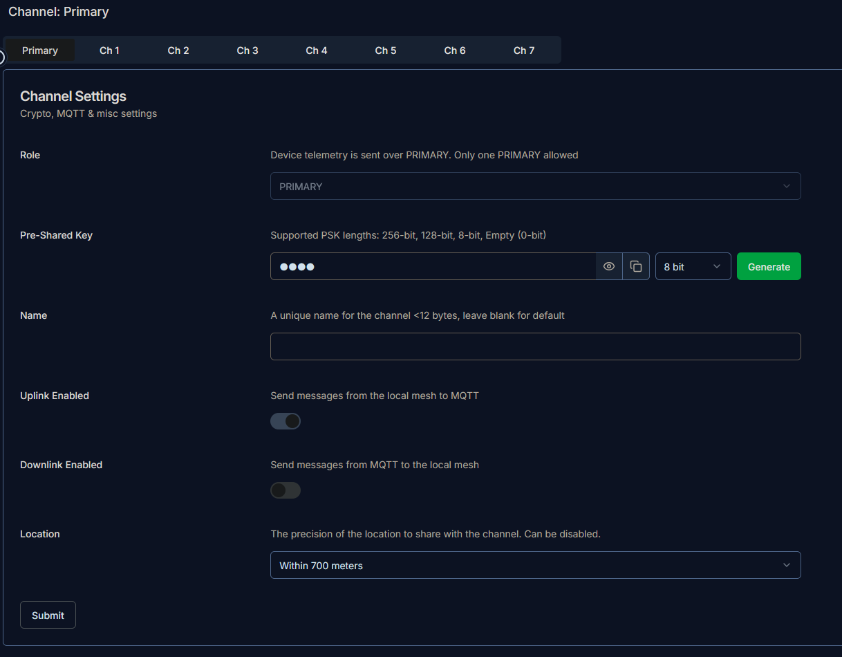 The default channel on Meshtastic is called "LongFast". This is the public channel that most all devices will be set up to use. If we were to change these settings, we wouldn't be able to see any new users, or transient users. Uplink and Downlink refer to MQTT traffic. We want nodes to have Uplink enabled, to push stats to the server, but not Downlink messages. This can create loops, and it means you will be receiving messages over IP, not via the mesh, which is way less cool. Location accuracy can be adjusted here, just as it can when publishing to MQTT. You do not need to edit the existing PSK of AQ==.